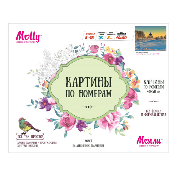 Увеличить Картина по номерам 40х50 Русская зима Артикул: KH0235 Нет в наличии 1 008 Р В корзину Купить в 1 клик В избранное Русскую зиму с бескрайними полями, усыпанными белым снегом, можно запечатлеть на холсте с помощью набора для рисования Молли. На заднем плане высится церковь с золтыми купалами. Снег потрясающе красиво сверкает от лучей закатного солнца.