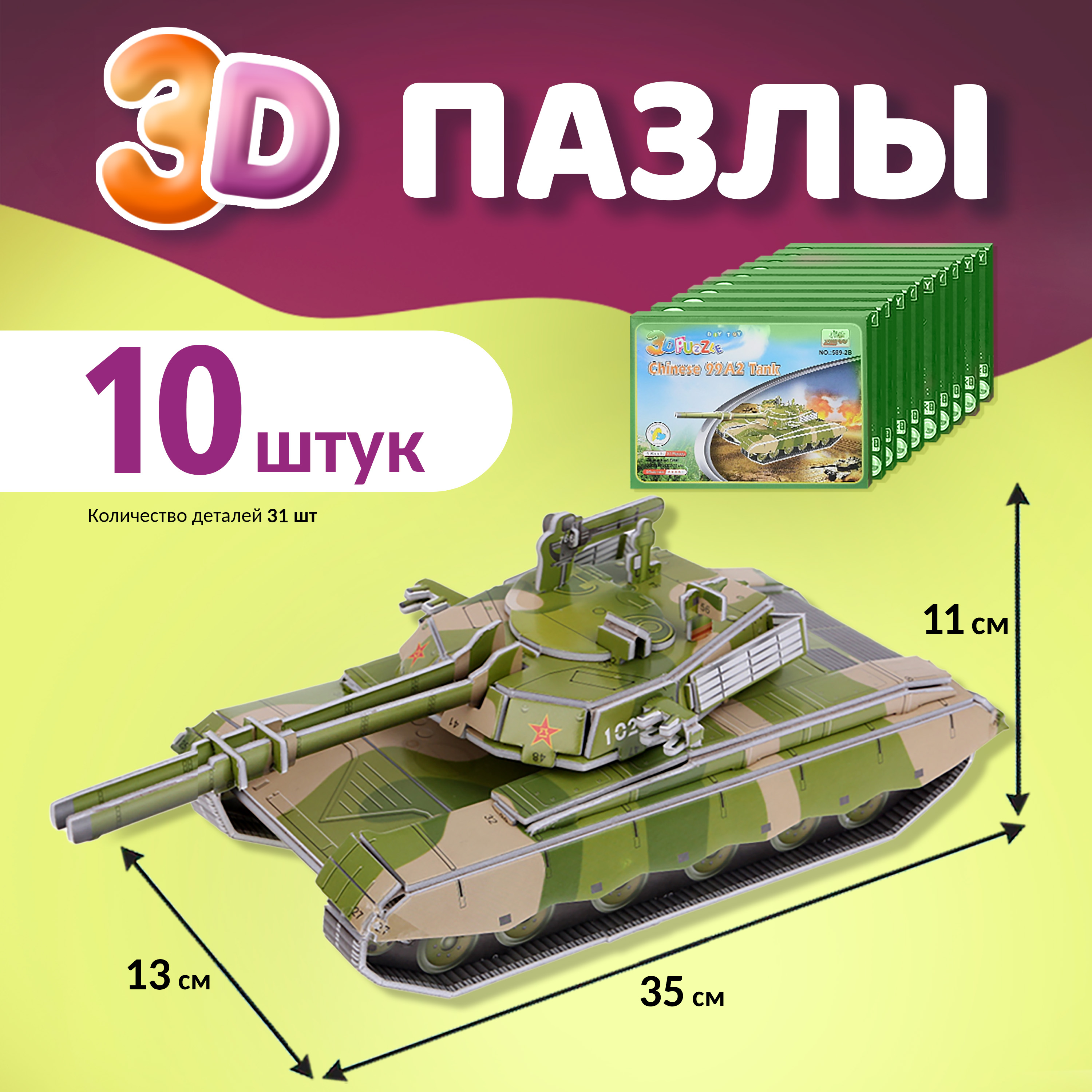 Увеличить 3D пазлы из пенокартона Танк Артикул: 589-2B-10 Много Количество - + 840 Р В корзину Купить в 1 клик В избранное Из деталей пазла можно собрать модель танка ""Тип 99"" с установленной башней. Данный тип является прорывом китайского танкостроения. Порядок сборки определяется нумерацией на краях деталей.
