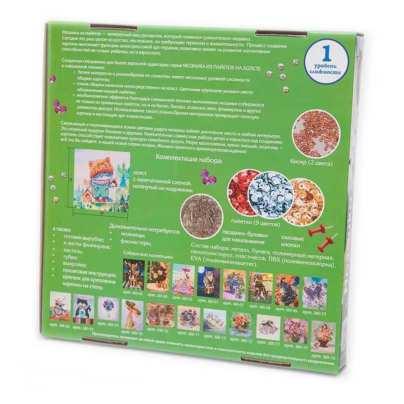 Увеличить Мозаика из пайеток на холсте Озорной котенок Артикул: МХ-26 Нет в наличии 824 Р В корзину Купить в 1 клик В избранное С помощью набора для творчества можно выложить на холсте мозаику из пайеток на холсте в смешанной технике. Благодаря одновременному использованию бисера, бусин, филигранных элементов, деталей из фоамирана готовая картина выглядит объемной.